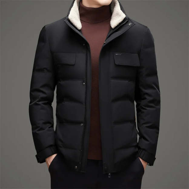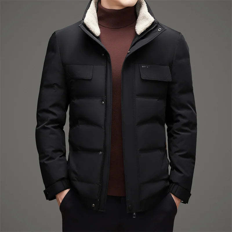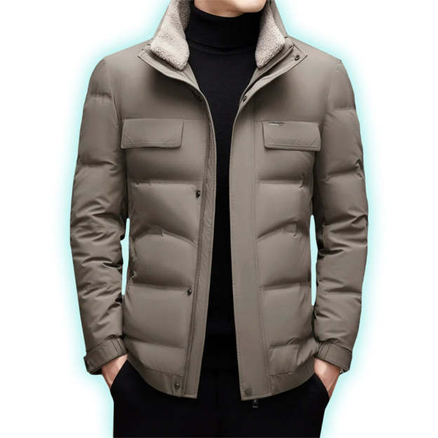 Sleek and insulated, this modern jacket combines puffer warmth with a tailored silhouette, accented by a soft fleece-lined collar for a cozy touch. Dual chest pockets and streamlined stitching elevate the design, making it a versatile piece for city commutes or weekend getaways.