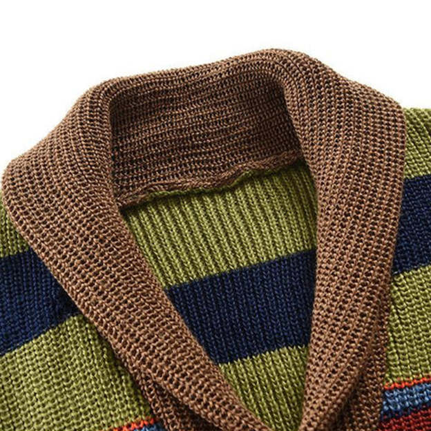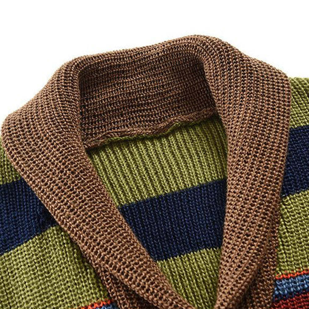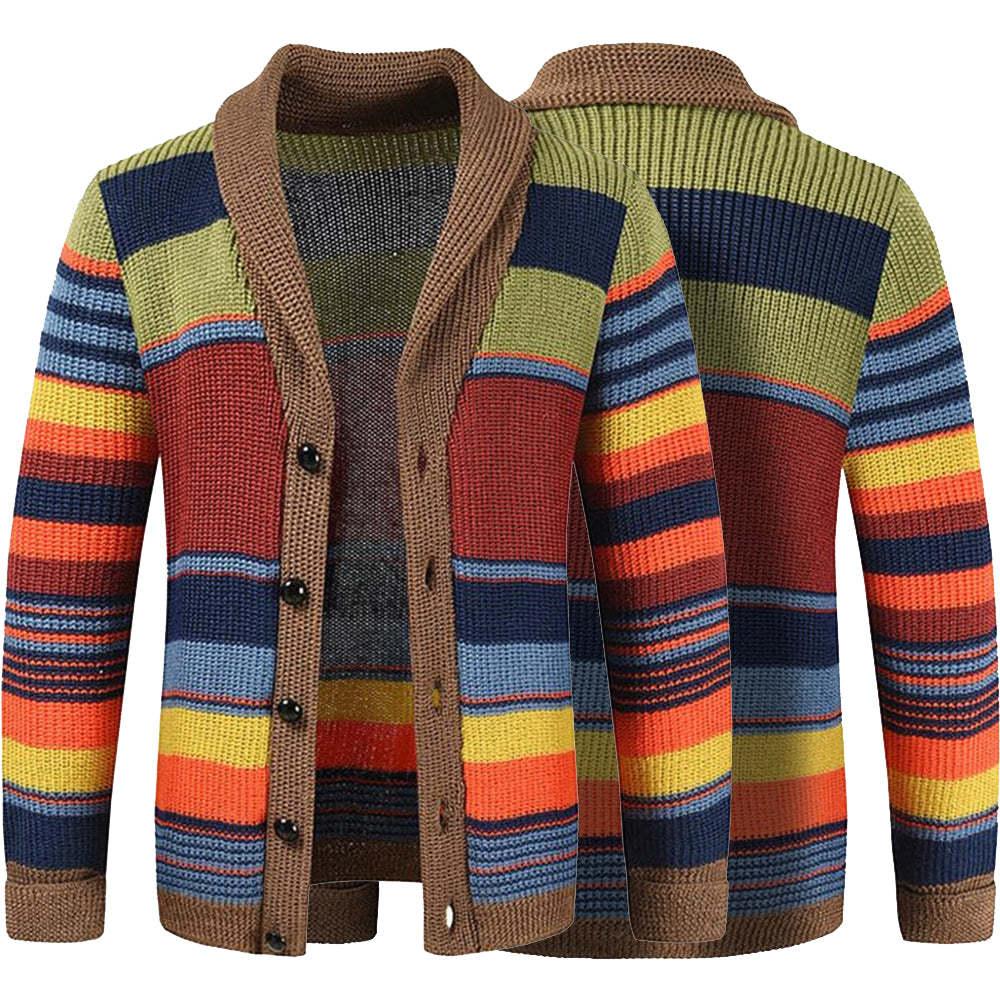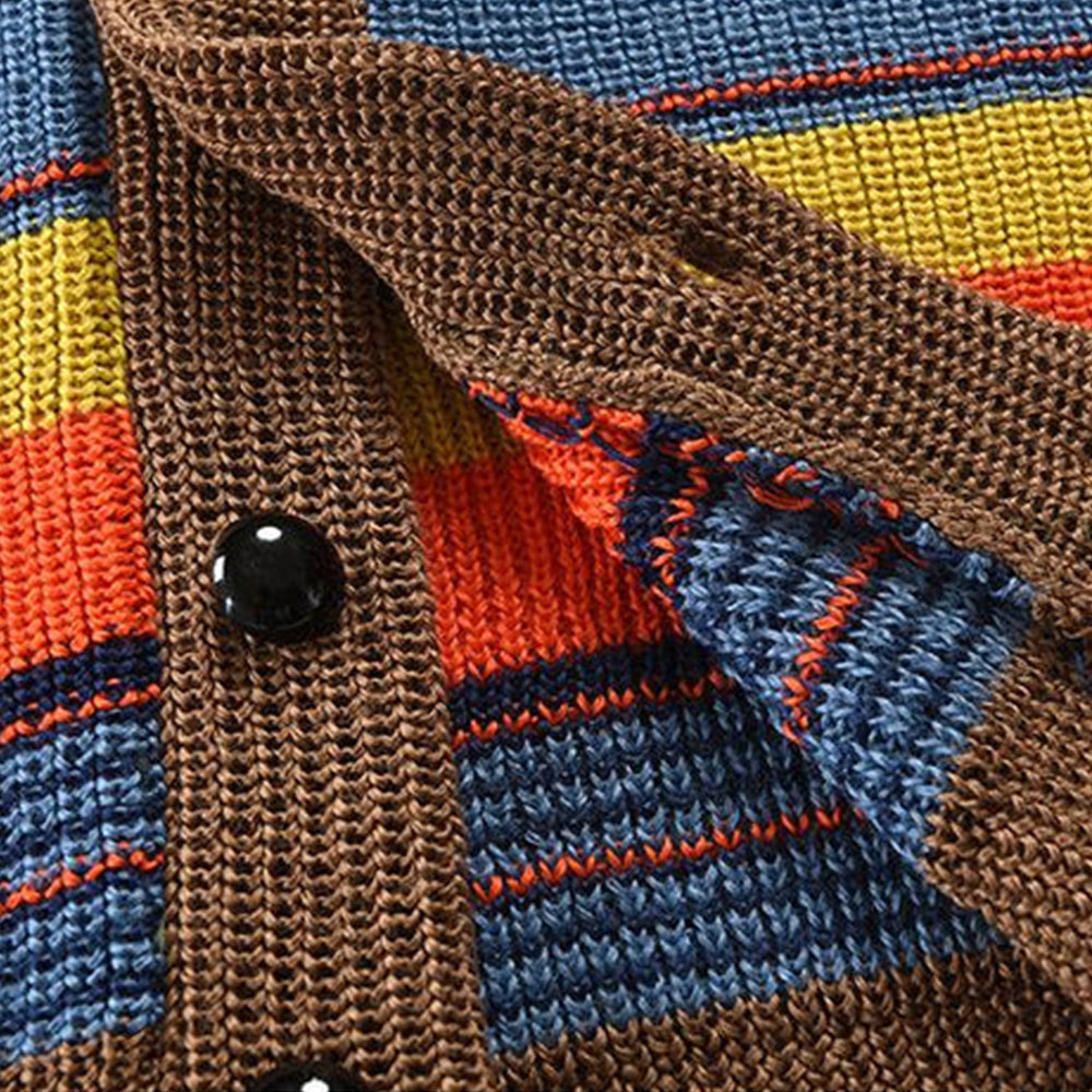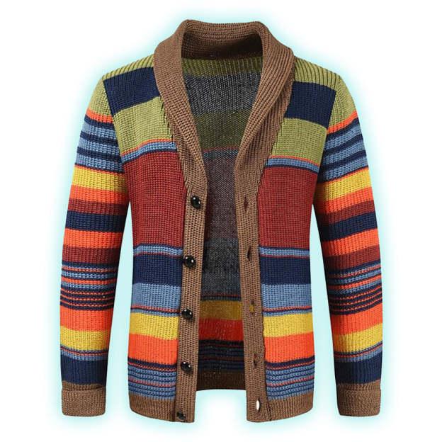 Boldly striped in earthy greens, fiery oranges, and ocean blues, this cardigan brings warmth and personality to any outfit. A cozy shawl collar and rustic brown trim add a classic touch to its playful palette. Perfect for those who love a mix of retro charm and modern flair.