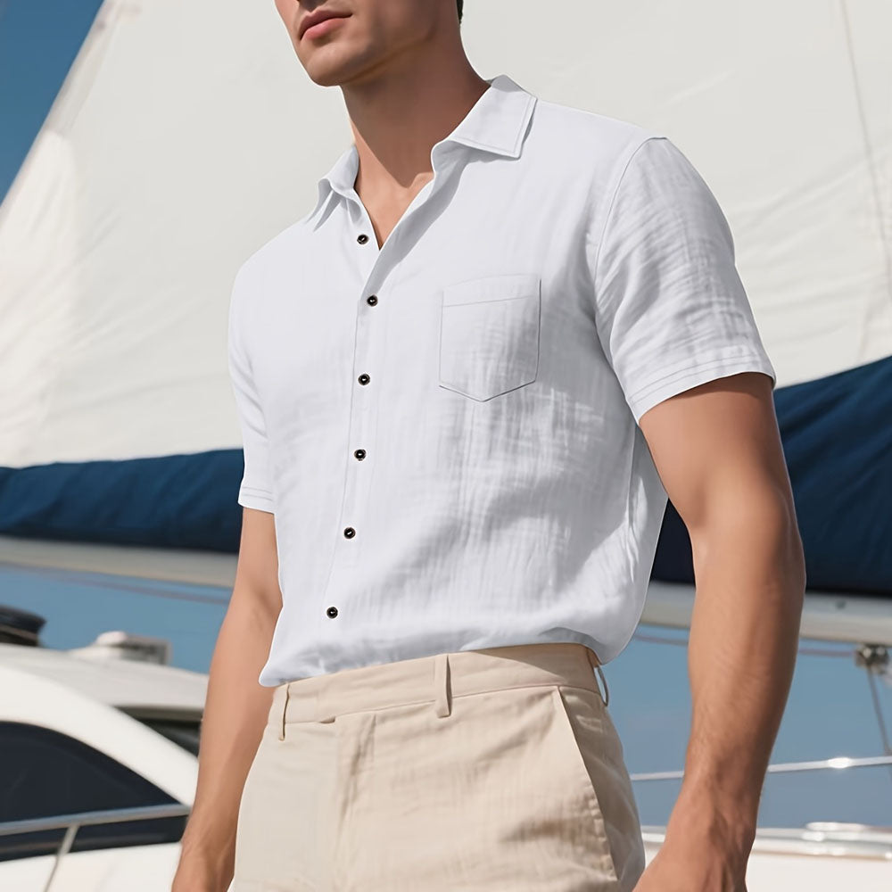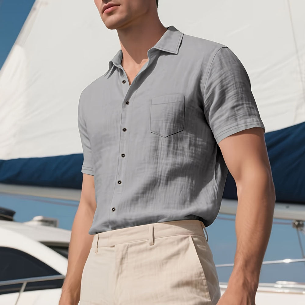 Hand sewn from breathable, lightweight fabric, this sky-blue short sleeve shirt exudes effortless coastal elegance. The pointed collar and sleek black buttons add a refined contrast, while the chest pocket enhances its casual charm. Perfect for sunny getaways, marina strolls, or laid-back summer socials.