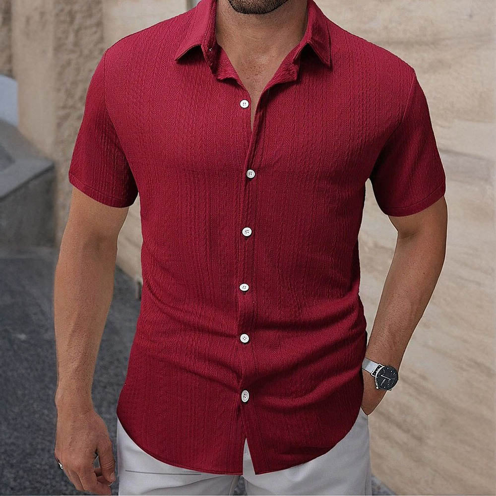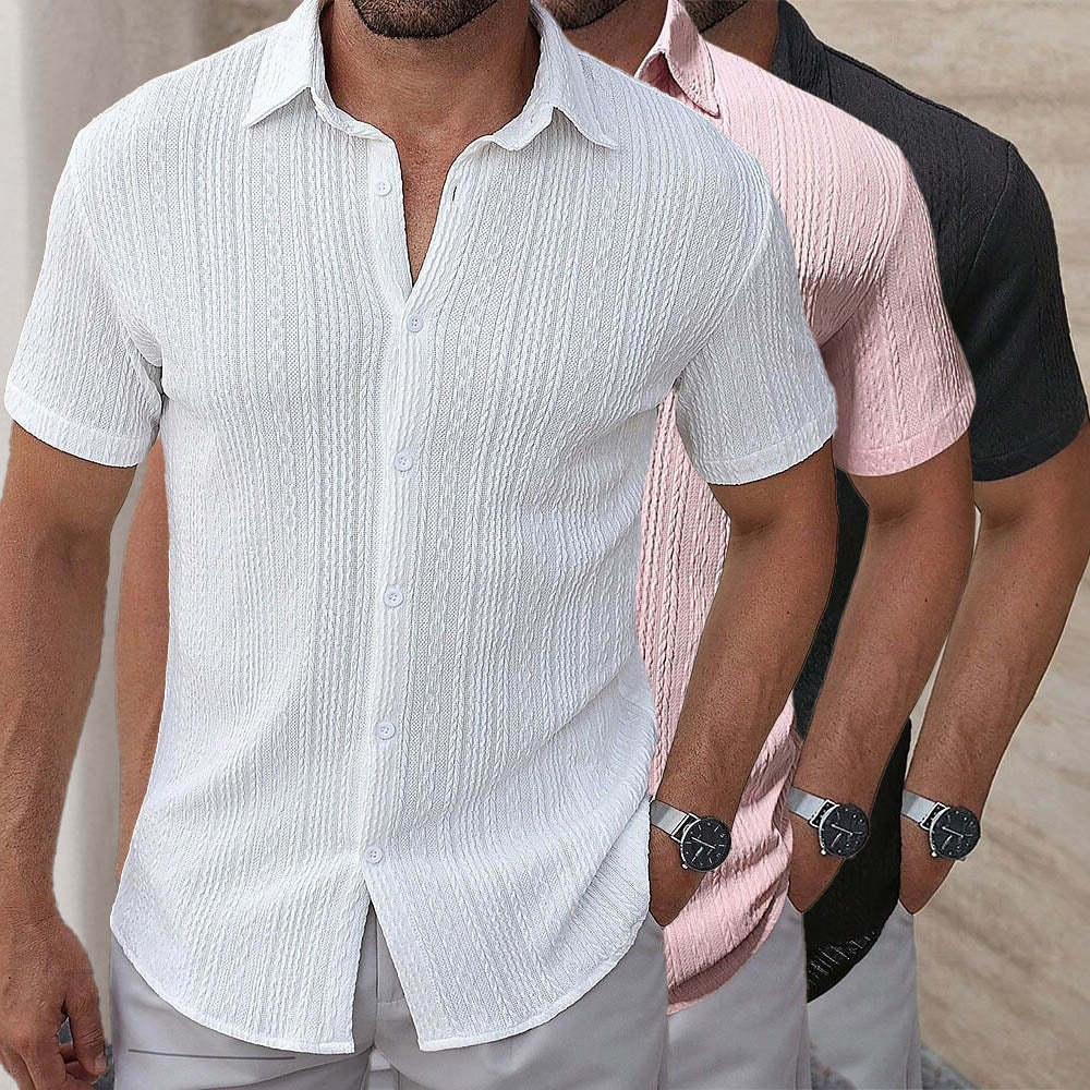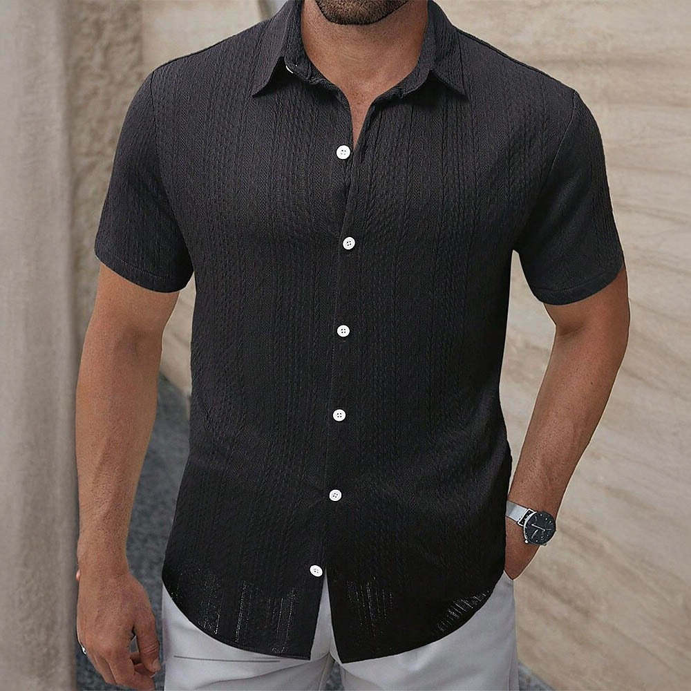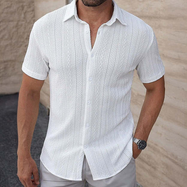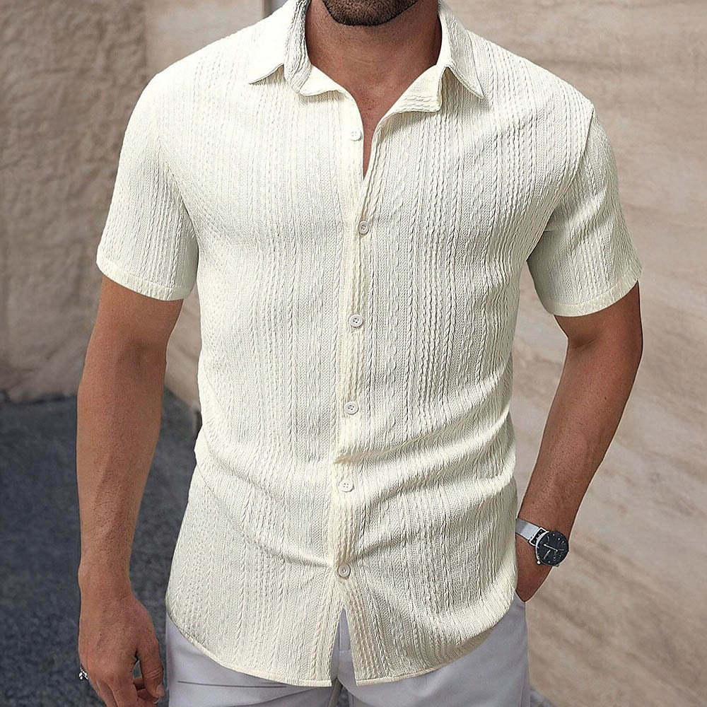 Tailored from textured fabric for a breezy feel, this short-sleeve shirt offers a clean silhouette with an open neckline for relaxed elegance. Its subtle vertical pattern adds depth without overwhelming the look. Ideal for sunlit days where comfort meets quiet sophistication.