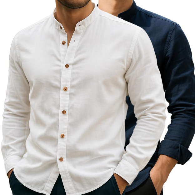 Tailored with precision and framed by a minimalist mandarin collar, this linen shirt delivers understated elegance in every thread. Sewn for breathability and ease, it’s a timeless essential for refined, effortless dressing.